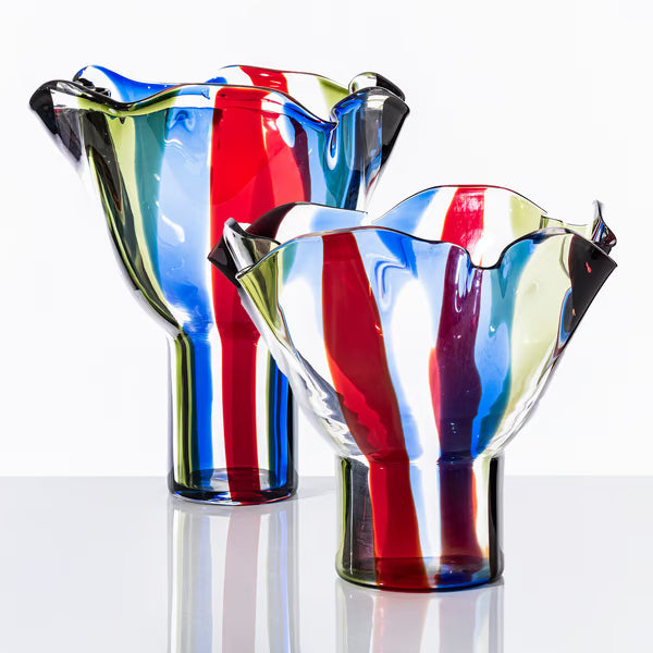 The colors of these works chase, touch and sometimes merge on the waves created by the breath of master glassmiths.