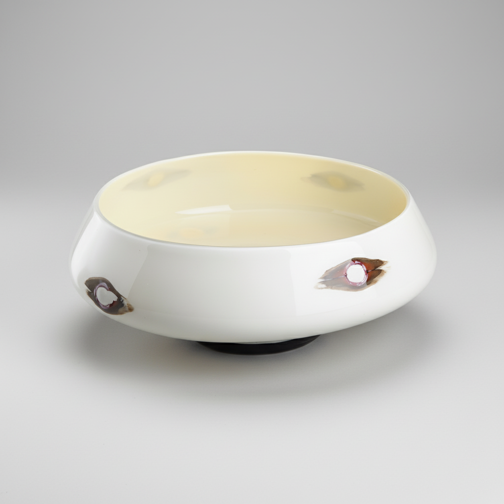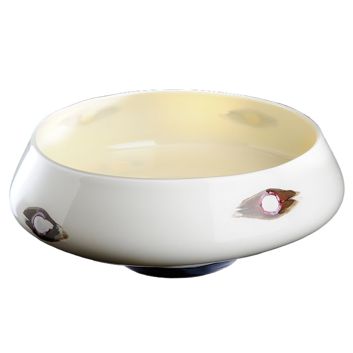 Italian artist and designer Diego Chilo collaborated with VENINI to create a collection of ten vases, one of which is Oriente. Crafted from opaque beige glass, the piece features melted copper rings interlaced with amber-tones. Through a unique thermal reaction, the copper fuses to the surface, producing a warm reddish sheen that enhances the vase’s organic character.
