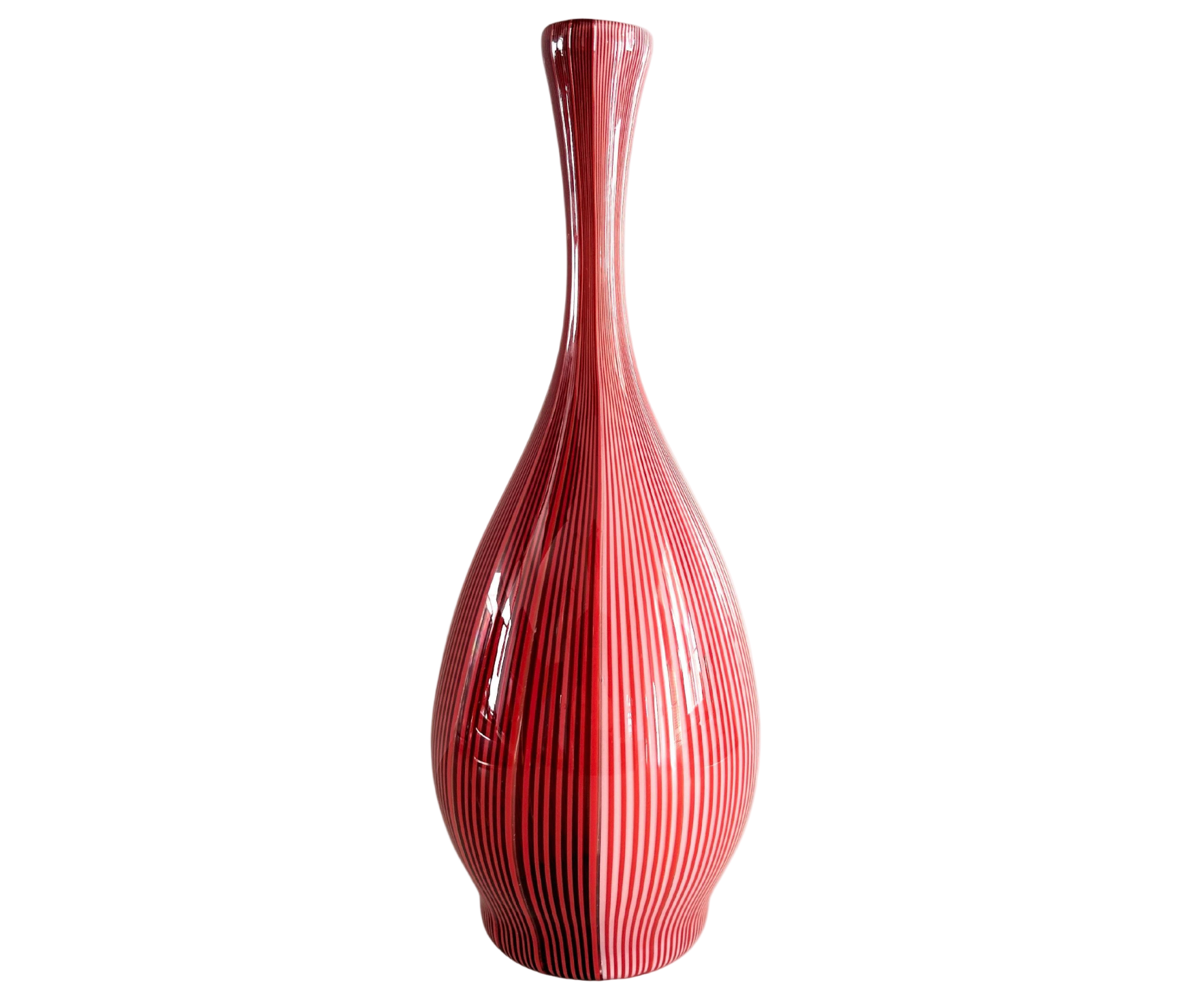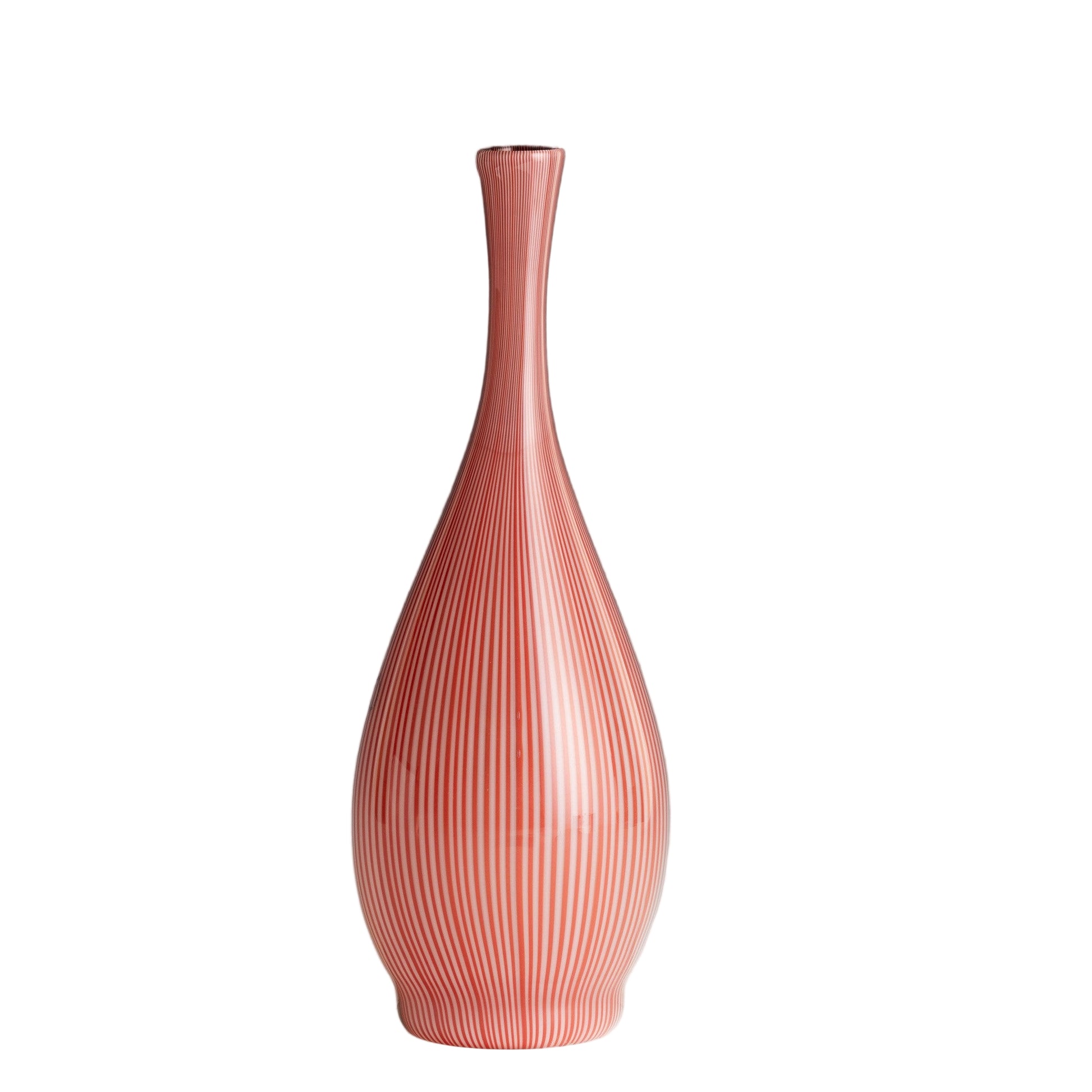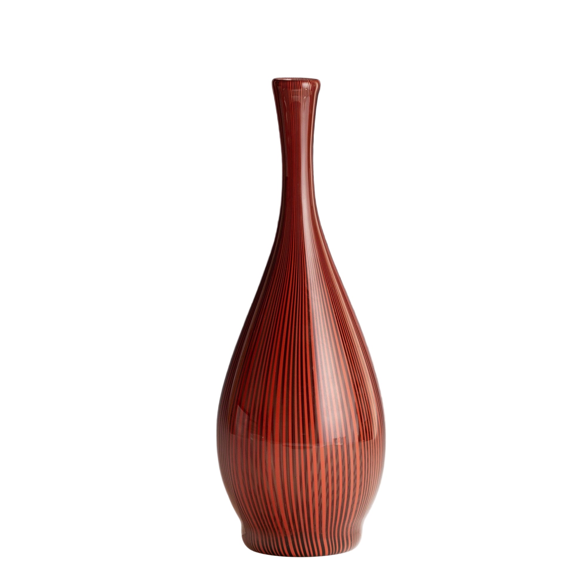 Celebrated for its tone-on-tone interplay of glass canes and its stepped-cylinder silhouette, the Tessuti Battuti vase by Carlo Scarpa is a masterpiece of the “cane” technique—where slender rods of coloured and lattimo (opal) glass are fused together, then hot-worked to reveal the fine vertical lines that define its form.